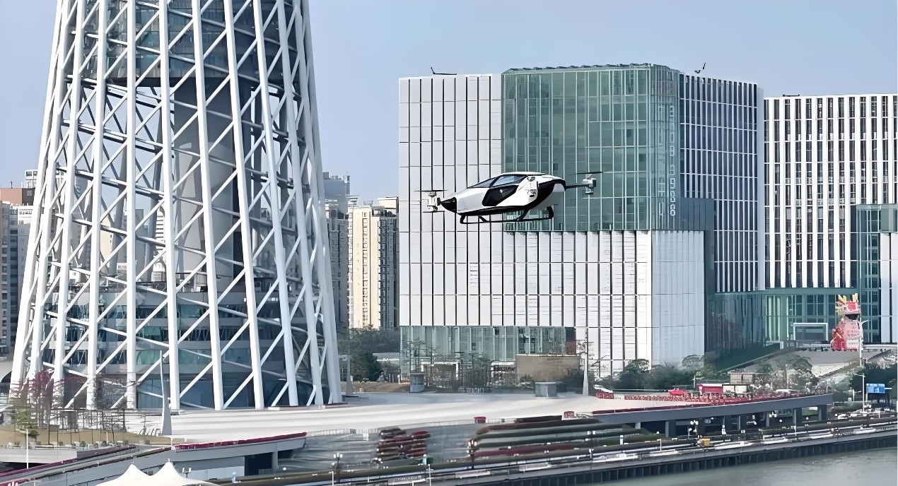 圖為2024年3月8日,小鵬匯天、合利智能等多家企業(yè)協(xié)調(diào),小鵬匯天飛行汽車旅航者X2順利完成城市CBD“天德廣場-廣州塔”區(qū)域的低空飛行。