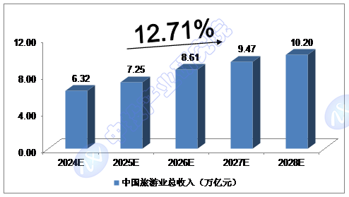 我們預(yù)計(jì),2024年我國旅游業(yè)總收入將達(dá)到6.32萬億元,未來五年(2024-2028)年均復(fù)合增長率約為12.71%,2028年將達(dá)到10.20萬億元。