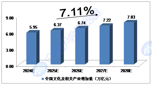我們預(yù)計(jì),2024年我國文化及相關(guān)產(chǎn)業(yè)增加值將達(dá)到5.95萬億元,未來五年(2024-2028)年均復(fù)合增長率約為7.11%,2028年將達(dá)到7.83萬億元。