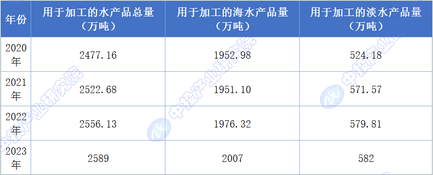 圖表:2020-2023年全國(guó)用于加工的水產(chǎn)品總量