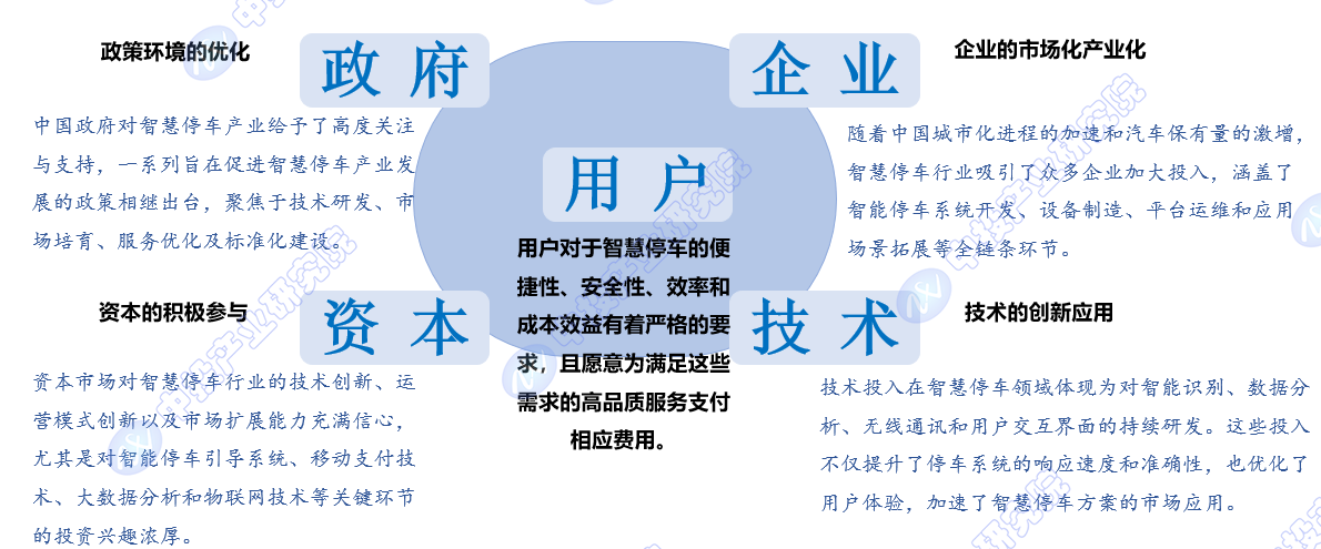 智慧停車產(chǎn)業(yè)在中國正處于快速發(fā)展階段,政策、資本、技術(shù)和市場需求的協(xié)同作用,正推動著產(chǎn)業(yè)向更高層次邁進,為中國乃至全球的科技革命和產(chǎn)業(yè)升級貢獻力量。以下是運用中投顧問原創(chuàng)的五要素模式,從政策、資本、技術(shù)、企業(yè)、用戶五個角度對智慧停車行業(yè)發(fā)展驅(qū)動因素的詳細分析:
