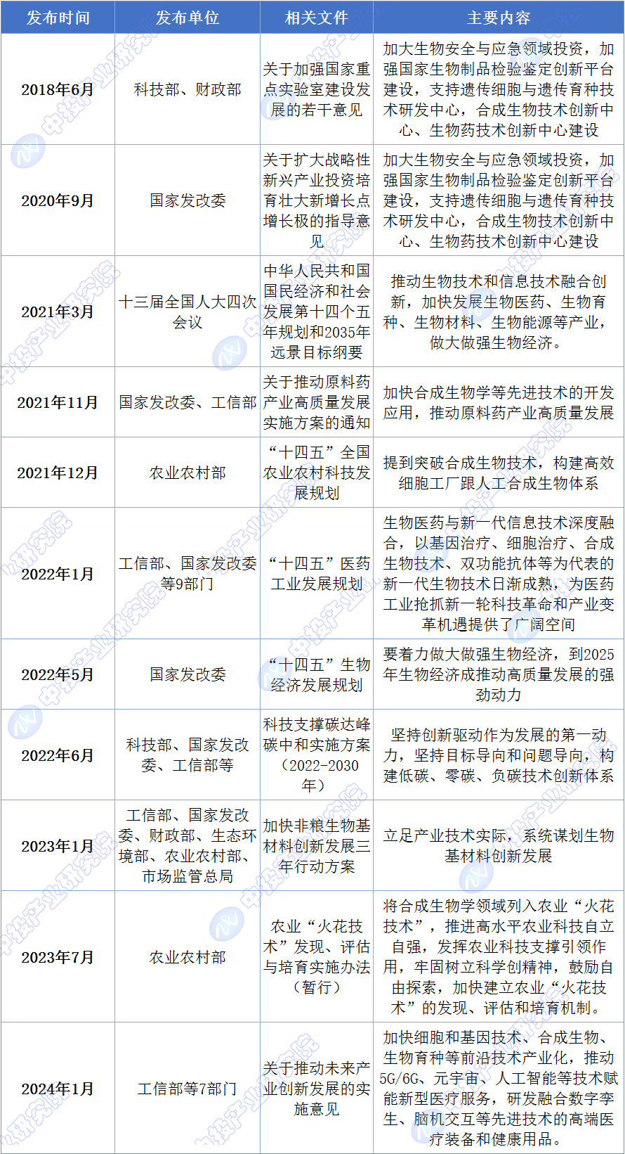近年來,我國高度重視合成生物產(chǎn)業(yè),密集出臺加快合成生物創(chuàng)新發(fā)展的政策文件,把合成生物制造列為新時期確保我國經(jīng)濟高質(zhì)量發(fā)展的戰(zhàn)新產(chǎn)業(yè)和未來產(chǎn)業(yè)。如2024年1月,工信部等7部門發(fā)布《關(guān)于推動未來產(chǎn)業(yè)創(chuàng)新發(fā)展的實施意見》,提出加快細胞和基因技術(shù)、合成生物、生物育種等前沿技術(shù)產(chǎn)業(yè)化。