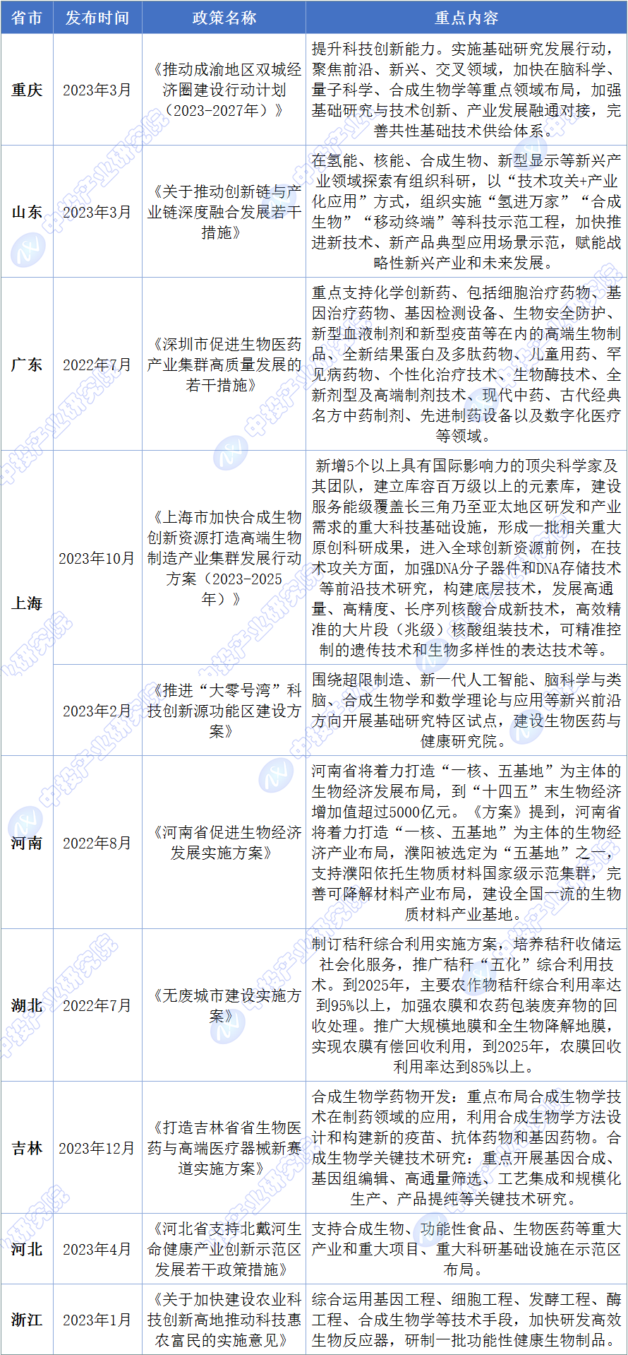 中投產(chǎn)業(yè)研究院發(fā)布的《2024-2028年中國未來產(chǎn)業(yè)之合成生物學(xué)行業(yè)趨勢預(yù)測及投資機會研究報告》指出:“十四五”以來,包括上海、廣東、河南、山東等多個省市出臺了合成生物學(xué)相關(guān)支持、規(guī)范類政策,內(nèi)容廣泛,主要從生物醫(yī)藥產(chǎn)業(yè)發(fā)展、高端生物制造、發(fā)展生物基材料、產(chǎn)業(yè)集群建設(shè)等方面展開規(guī)劃: