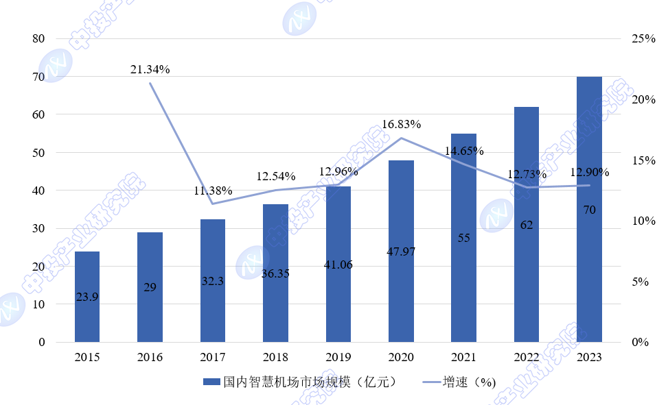圖表:2015-2022年國內(nèi)智慧機(jī)場(chǎng)市場(chǎng)規(guī)模及增速