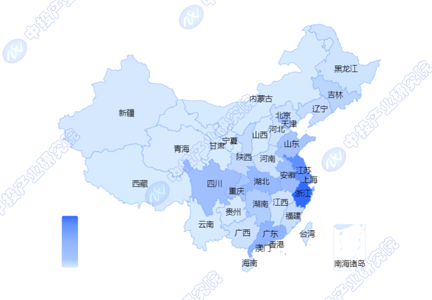 示該技術(shù)領(lǐng)域在中國(guó)各省市的專利申請(qǐng)量分布。申請(qǐng)量較大的區(qū)域,該地區(qū)通常有相關(guān)技術(shù)集群,相關(guān)技術(shù)的研究較為先進(jìn)。顏色越深表明申請(qǐng)量越多,鼠標(biāo)定位到右側(cè),顏色條會(huì)顯示對(duì)應(yīng)的申請(qǐng)量,地圖中相應(yīng)申請(qǐng)量的區(qū)域也會(huì)高亮。