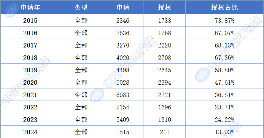圖表:2015-2024年中國氮化鎵技術(shù)領(lǐng)域?qū)@暾?qǐng)及授權(quán)量