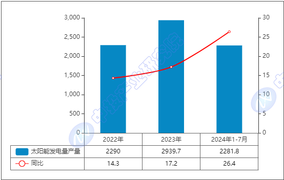 圖表:2022-2024年中國太陽能發(fā)電量趨勢圖