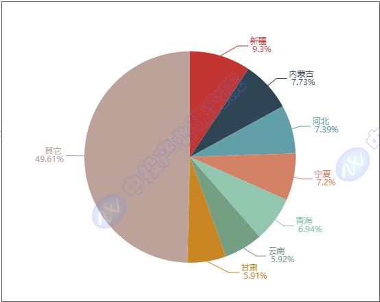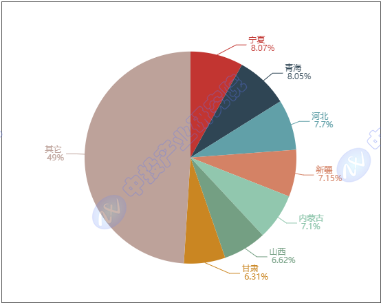 2022年1-12月,太陽能發(fā)電量分布較為集中,前七的省份依次為寧夏、青海、河北、新疆、內(nèi)蒙古、山西、甘肅,累計總占全國總的51%。
