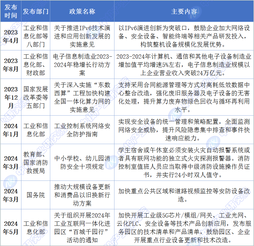 中國政府對安防行業(yè)的大力支持為安防行業(yè)提供了良好的發(fā)展環(huán)境。2024年3月,國務(wù)院印發(fā)《推動大規(guī)模設(shè)備更新和消費(fèi)品以舊換新行動方案》,提出:加快重點(diǎn)公共區(qū)域和道路視頻監(jiān)控等安防設(shè)備改造。2024年5月,工業(yè)和信息化部印發(fā)《關(guān)于組織開展2024年工業(yè)互聯(lián)網(wǎng)一體化進(jìn)園區(qū)“百城千園行”活動的通知》,提出:加快開展工業(yè)級5G芯片/模組/網(wǎng)關(guān)、工業(yè)光網(wǎng)、云化PLC、安全設(shè)備等技術(shù)產(chǎn)品創(chuàng)新應(yīng)用,發(fā)布服務(wù)園區(qū)的技術(shù)清單和產(chǎn)品清單,鼓勵園區(qū)、企業(yè)開展重點(diǎn)行業(yè)設(shè)備更新和技術(shù)改造。