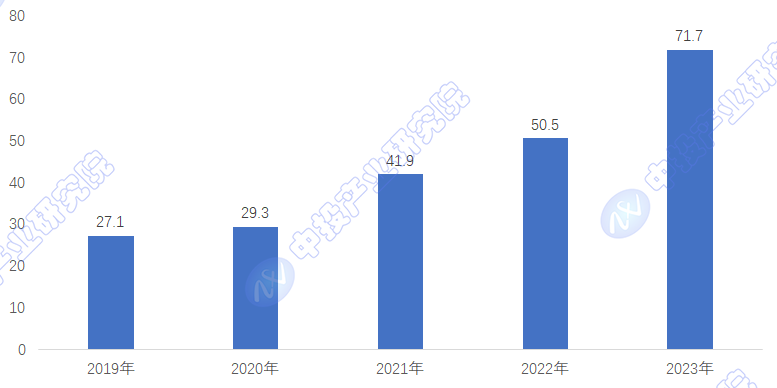 隨著國家大力支持創(chuàng)新醫(yī)療器械發(fā)展,手術機器人作為重點發(fā)展支持方向正在國內醫(yī)院快速普及。2023年中國手術機器人市場規(guī)模達到約71.7億元,近五年年均復合增長率達27.54%。