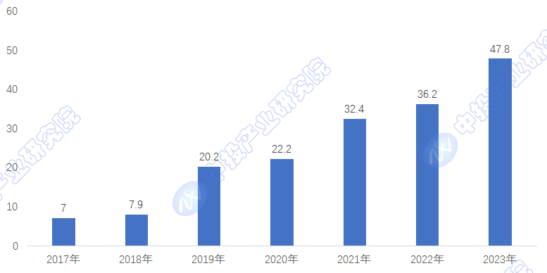 2017年至2021年,中國腔鏡手術機器人市場規(guī)模自7.0億元增長至32.4億元,復合年增長率為46.7%,其中設備的復合年增長率為75.6%,耗材為31.6%,服務為39.5%。2023年中國腔鏡手術機器人市場規(guī)模達47.8億元,預計未來中國腔鏡手術機器人市場規(guī)模將持續(xù)增長。