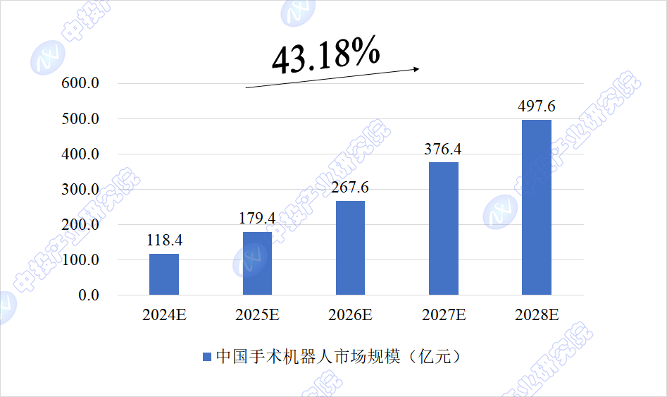 2022年,中國手術機器人市場規(guī)模達到50.5億元;2023年,中國手術機器人市場規(guī)模達到71.7億元。中投產(chǎn)業(yè)研究院預計,2024年中國手術機器人市場規(guī)模將達到118.4億元,未來五年(2024-2028)年均復合增長率約為43.18%,2028年將達到497.6億元。