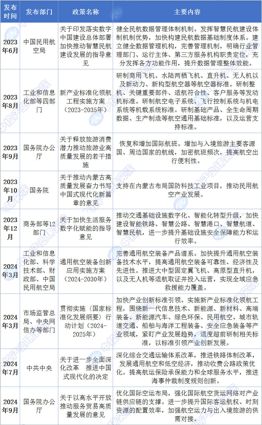 2024年3月,工業(yè)和信息化部、科學(xué)技術(shù)部、財(cái)政部、中國(guó)民用航空局聯(lián)合印發(fā)《通用航空裝備創(chuàng)新應(yīng)用實(shí)施方案(2024-2030年)》,提出:完善通用航空裝備產(chǎn)品譜系。加快提升通用航空裝備技術(shù)水平,提高通用航空裝備可靠性、經(jīng)濟(jì)性及先進(jìn)性。推進(jìn)大中型固定翼飛機(jī)、高原型直升機(jī),以及無(wú)人機(jī)等適航取證并投入運(yùn)營(yíng),實(shí)現(xiàn)全域應(yīng)急救援能力覆蓋。2024年7月,中共中央印發(fā)《關(guān)于進(jìn)一步全面深化改革 推進(jìn)中國(guó)式現(xiàn)代化的決定》,提出:深化綜合交通運(yùn)輸體系改革,推進(jìn)鐵路體制改革,發(fā)展通用航空和低空經(jīng)濟(jì),推動(dòng)收費(fèi)公路政策優(yōu)化。提高航運(yùn)保險(xiǎn)承保能力和全球服務(wù)水平,推進(jìn)海事仲裁制度規(guī)則創(chuàng)新。2024年9月,國(guó)務(wù)院辦公廳印發(fā)《關(guān)于以高水平開(kāi)放推動(dòng)服務(wù)貿(mào)易高質(zhì)量發(fā)展的意見(jiàn)》,提出:優(yōu)化國(guó)際空運(yùn)布局,強(qiáng)化國(guó)際航空貨運(yùn)網(wǎng)絡(luò)對(duì)產(chǎn)業(yè)鏈供應(yīng)鏈的支撐。進(jìn)一步提升國(guó)際客運(yùn)航權(quán)、時(shí)刻資源的配置效率,加強(qiáng)航空運(yùn)力與出入境旅游的供需對(duì)接。